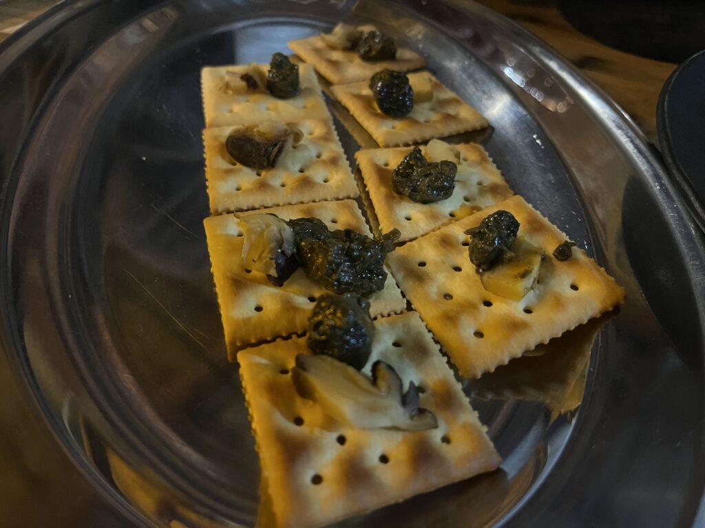 肝が残ったものと燻製をクラッカーに乗せると‥