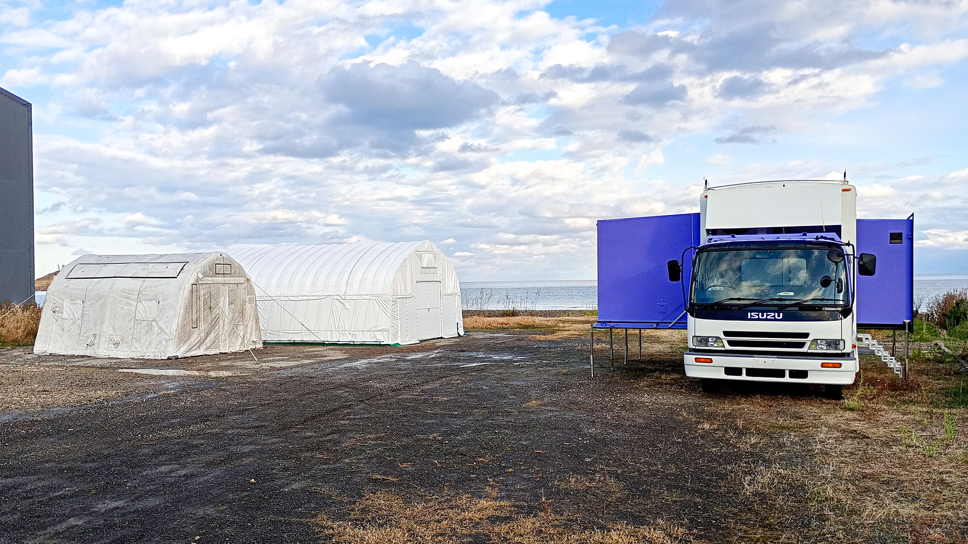 珠洲の空の下、存在感を放つ防災用エアーテントと災害対策車。