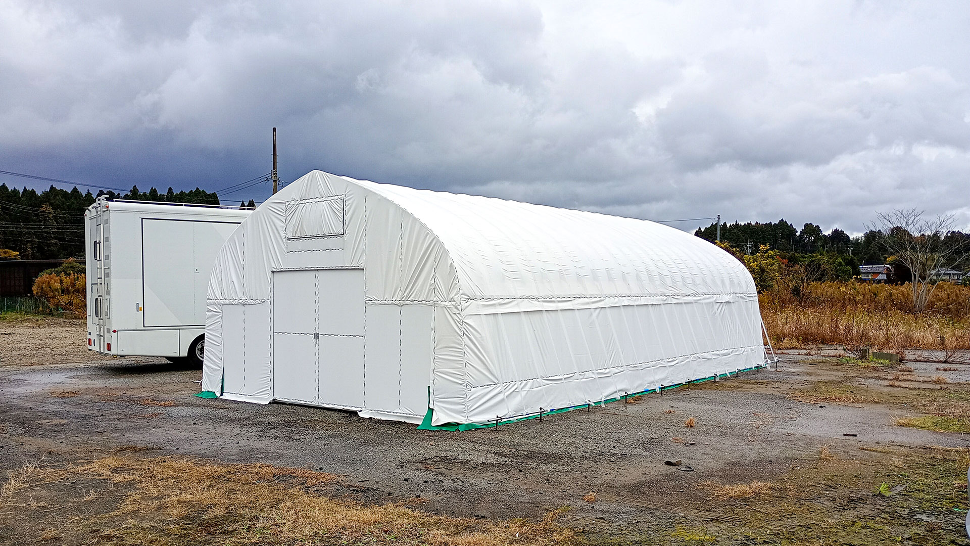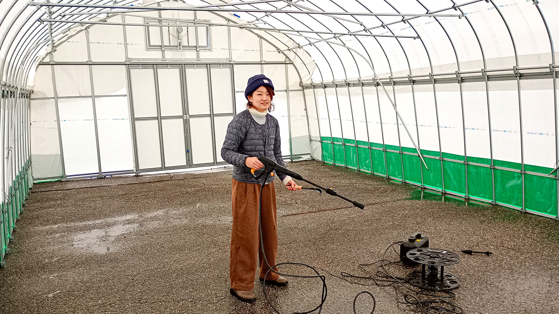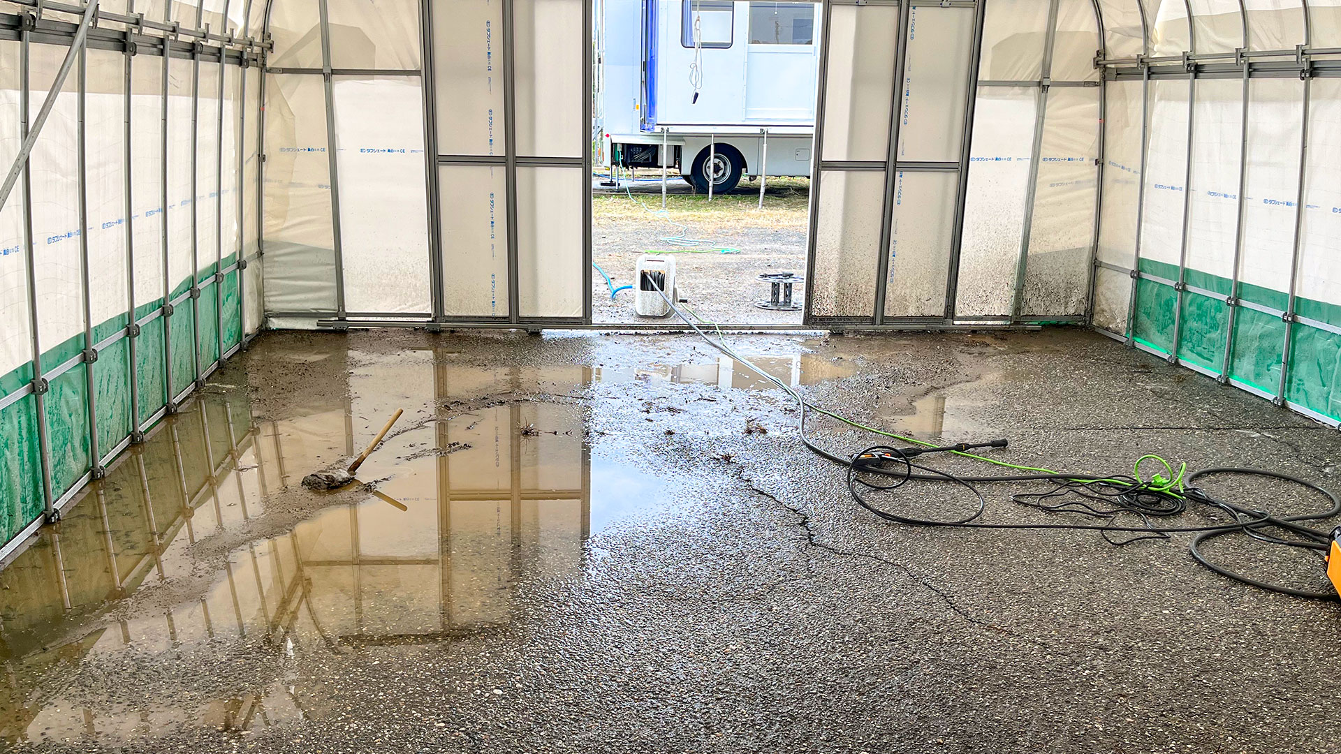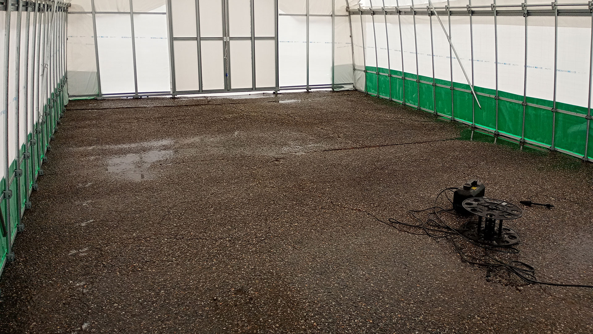 先日建設した私たちの拠点となるビニールハウス。建物自体は立派に建ち上がったものの、足元は雨の影響で重たい泥が溜まり、土の臭いも充満している状態でした。