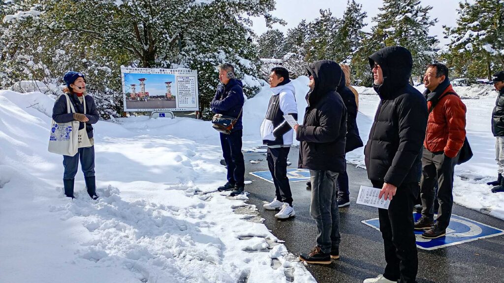 12~2月はツアー参加者が激減するため、このような積雪の中でもお越しいただき、とっても有難く思います。約1時間のご案内でしたが、地震で壊れた橋や揺れと津波で更地となった宝立町商店街、津波が到達し、液状化被害を受けた飯田港をご見学いただきました。